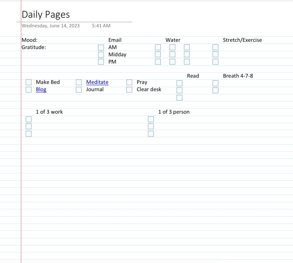 The mood entry is how I am feeling as I start my day. After mood I like to say 3 things I am grateful for in that very moment, always searching for at least 1 item of gratitude that is a bit obscure. Some thing like that little latch component in a car that keeps the door closed.