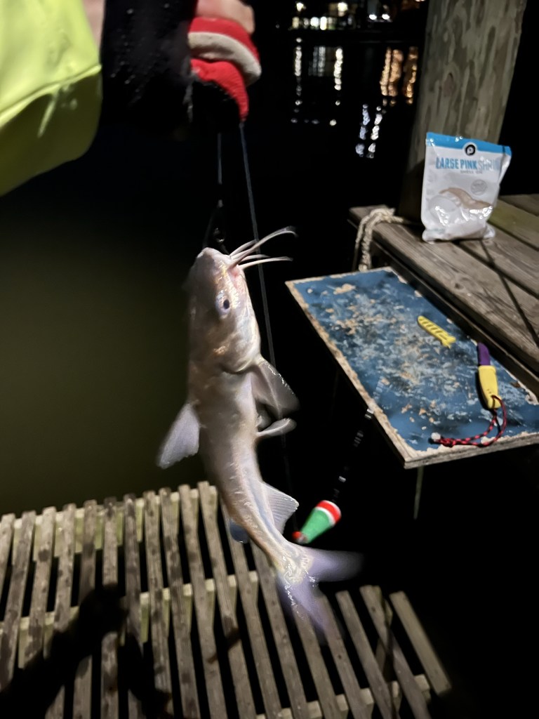 The first cast I caught the largest catfish I had caught since being here. Then larger and larger cats kept popping up. then things died down a bit.